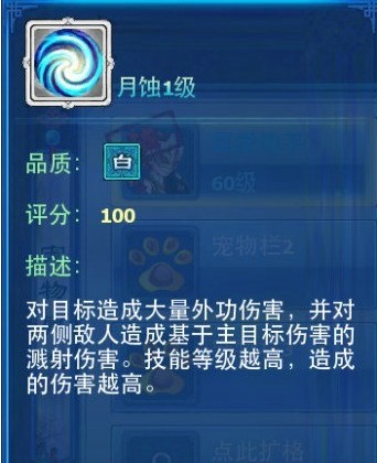 2、月蚀的AOE能力,月蚀是这个游戏里面输出最高的技能这是这是不用解释的,PVP阵法是可以避免月蚀的伤害,但是宝宝是一排的月蚀清宝宝的能力十分突出尤其是爆击的时候,至于说打架秒不掉侠客,我只能说一句你宝宝的攻击太低。