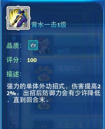 满级背水的加攻击百分之60单体伤害非常厉害,但背水缺陷很明显减少防御百分之20,单体功高就是要去秒人速度必须比别人快,但是打完之后减的防御会让法宝宝轻松点掉你。所以背水是个比较矛盾的技能。