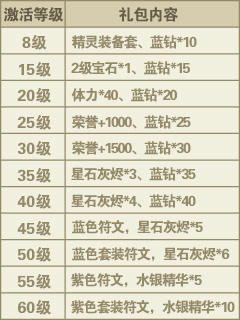 注:玩家只要在游戏内达到相应的等级即可获得“豪华等级礼包”相对应的奖品。