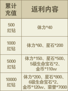 活动规则:只要玩家当日充值到达一定额度,即可获得相应返利,多充多送,还不快来!