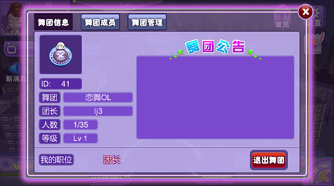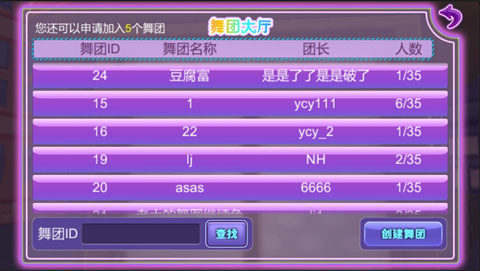 想要壮大舞团吗?想要受人瞩目吗?玩家可以在舞团大厅创建舞团名,填写日期、团长名、舞团介绍及舞团序列号,来吸引玩家进入参与,壮大自身队伍。
