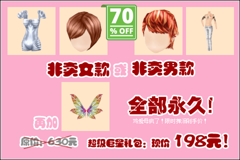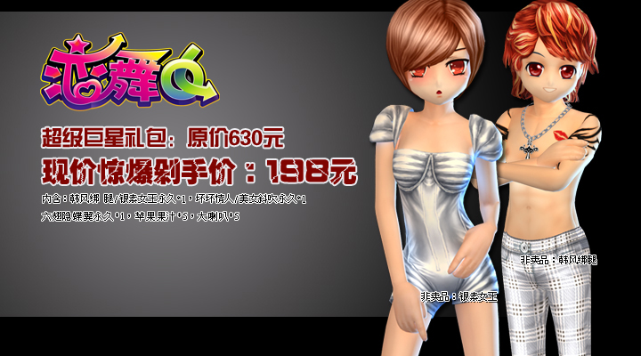 礼包内容:超级巨星礼包:原价630元,现价198元!70%的打折优惠!包含六翅隐蝶翼(永久),苹果果汁*5,大喇叭*5;男生:韩风绑腿(永久)+坏坏情人(永久)/女生:银素女王(永久)+美女斜吹(永久)。你没有看错,该礼包中的服饰和翅膀装饰全部都是永久的!尤其服饰发型均为非卖品,错过了商城中可再难拥有如此靓丽的身影啦!
