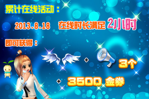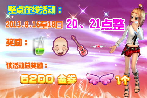 活动奖励:2013/8/16 21点准:金券688+苹果果汁*3;2013/8/17 20点准:金券688+满足男/满足女*7天;2013/8/18 20点准:金券288+小猫鼻子*7天 21点准:金券888+粉红吉他*7天。