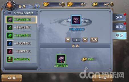 打开强化界面,可以看到宝石合成的标签。玩家可以通过宝石合成将低等级的宝石合成为高等级宝石,提升属性。