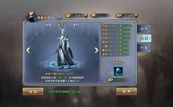 侠客培养也是提升侠客很重要的一环,每个侠客都能在基础属性上再次进行提升。提升的属性是有极限的,提升到极限就无法再进行提升了。我们只需要花费培养丹就能进行侠客的培养了。