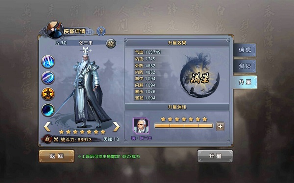 侠客升星也很重要,侠客的基础星级最高为3级,之后还能再收集侠客的碎片然后进行提升。最高星级为5星。侠客星级提升之后能大幅度的提升属性。