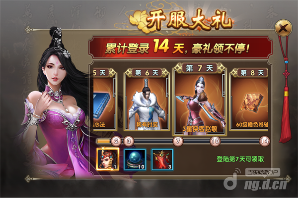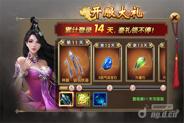 开服后14天,登录游戏天天有好礼,超强橙装、高级宝石,强力侠客、稀有神器等你拿,炫酷时装、拉风坐骑,价值1500 RMB免费送!
