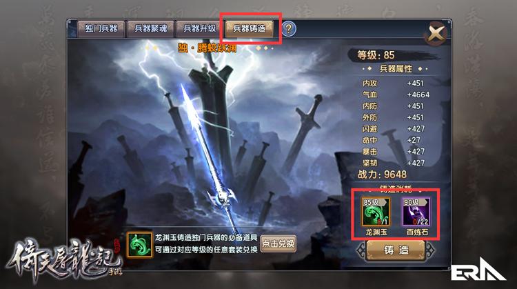 各位侠士铸造独门兵器所必备的道具是龙渊玉,可以通过对应等级的任意套装来兑换。使用龙渊玉和百炼石能够合成兵器,铸造成功后的兵器有8条初始属性,继续使用龙渊玉和百炼石可以对兵器进行升级,升级成功后会使属性得到大幅提升。
