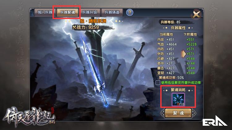 另外,和侠客升阶类似,独门兵器还可以通过道具进行聚魂(同时使用聚灵符提升聚魂成功率),聚魂成功会属性也会得到提升,替换兵器时属性会自动继承。总之就是极品由己造,属性各种逆天飙升!