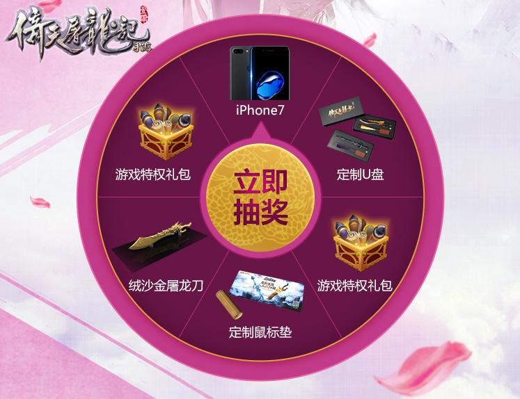 9月21日-27日活动期间,在新服【碧水寒潭】创建新角色的玩家,前往大都(坐标177.139)寻找官方GM并添加其为好友,每完成一个任务就能获得一组抽奖码。抽奖码可在官方微信公众号进行抽奖,特权礼包、《倚天屠龙记》手游定制U盘、古风竹简鼠标垫、24K镀金屠龙刀摆件、iPhone7应有尽有,中奖率100%!你最想要的大奖就在这里,呼唤着你!