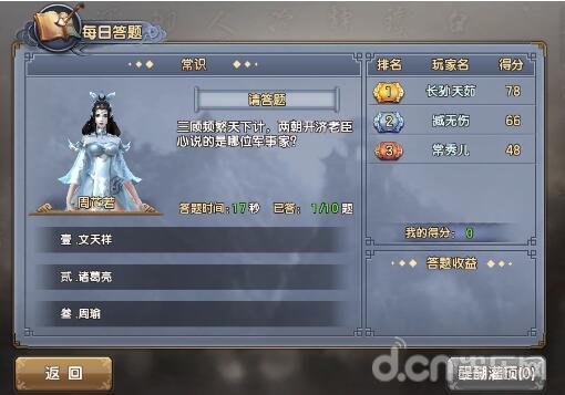 玩家点击活动列表中的每日答题即可进入游戏开始答题,玩家依据自己的知识选择正确答案,每题作答时间不得超过20s(超时视为答错),当玩家完成所有题目时,将按照作答时间及答对题目数量计算积分,参与答题排行。