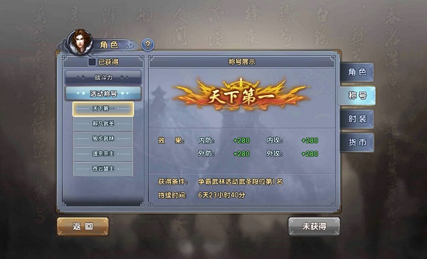 称号分为战力和活动称号两种,通过达成不同的战力条件获得的称号为永久,参加比武大会等获得的称号有时效性。