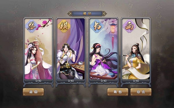 藏品分为琴、棋、书、画四大类,也算是中华古典文化的传承。每一大类下都有大量的历史上有名的藏品,如“书”中的史记、道德经、孙子兵法等。