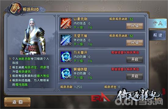 目前个人可以提升的科技条目有9条。分别对应角色的五大基础属性外加命中、闪避、暴击、坚韧。玩家需要消耗个人帮派贡献提升个人科技等级,而个人科技可提升最大等级与帮派等级挂钩,帮派等级越高,个人科技可升级等级越高。帮建科技目前包含外塔、内塔、攻城车、投石车和帮派大旗5种帮战设施。
