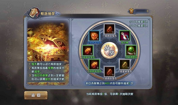 福利类的包括帮派红包、帮派抽奖、帮派商店等。有土豪在帮派里发红包的时候千万记得抢,这可是发家致富的好路子呢。帮派抽奖则可以每日免费抽奖一次,帮派等级越高免费抽奖的次数就越多,当每日贡献度达到一定程度后,可以获得额外的抽奖次数。在帮派商店中,可以消费帮贡来获得侠客魂和各种道具。