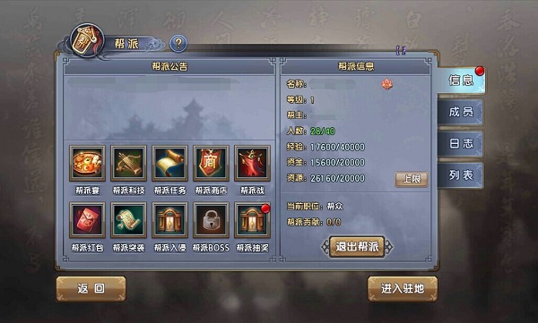 加入帮派后,我们就可以享受到帮派的各种福利和权益了。在帮派界面上,可以很清楚的看到当前帮派的状态,福利和活动都一目了然。