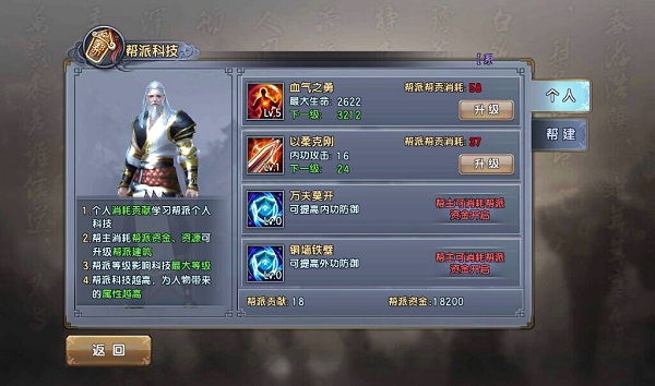在帮派中,帮贡的作用非常大,除了在帮派商店里购买道具外,还可以修习帮派技能,增加人物的属性,属性增益效果非常明显。所以,各位大侠记得加入帮派后一定要多做帮派任务提升帮贡,来为自己换取更大的利益吧。