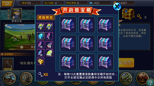 在选择副本界面点击不同的宝箱会打开对应的宝箱界面,每个宝箱界面中有九个宝箱,开启宝箱会得到道具奖励,每次打开宝箱所需要的要是数量都会递增(钥匙不会消耗)。