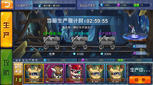 2、其中可以选择生产效率的矿车,但矿车使用需要的钻石也不通,生产效率不变的为免费,2倍的矿车每次使用需消耗100钻石,生产效率3倍的矿车需消耗300钻石。