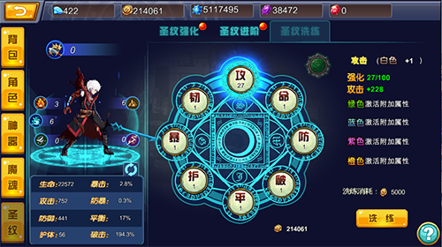 界面区域下面显示当前圣纹附加的所有属性;上面左边显示圣纹图片;里面可以点击选择圣纹。右边显示圣纹详情区域,未选择圣纹时,提示“选择圣纹后进行洗练”。
