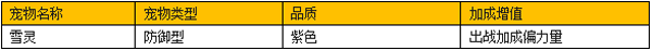 全身雪白,记着一个红色围巾的小熊。做着各种滑稽好笑的动作,是不是很萌呐?其实小熊除了很萌以外,属性也特别给力。雪灵属于防御型灵宠,萌萌的外表之下有着憨厚敦实的心灵。出战加成偏力量,算是紫色宠物中的佼佼者!