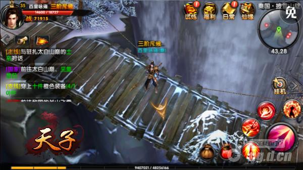 年度热血骑战动作手游《天子》全新版本“皇城争霸”震撼上线!端游级经典国战体验,还原最初的国战激情:独创“MMO”超大自由世界,尽享自由PK;丰富玩法体验,攻城野战成就一世英豪。跨服争霸体验热血掌上国战;仙灵转生,帮会建设,自由转职,打造真正属于你的“英雄”。更有边境争夺、押运粮草、刺探情报、组队禁地等超多团战PK玩法等你体验哦![详情]