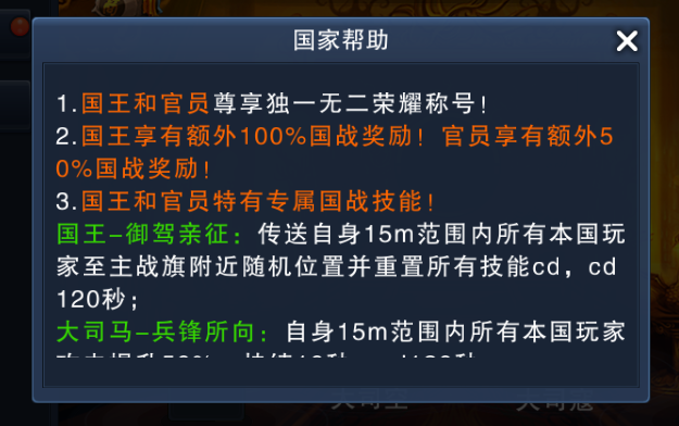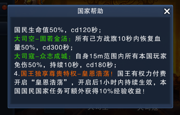 2、国王可以消耗元宝开启“皇恩浩荡”,从开启后1小时内持续生效,在该状态下该国国民做国家任务可额外获得10%经验收益;