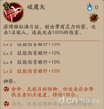 破魔矢:组合①击先和④舍命,舍命无视防御,在斗技里面满级源博雅一箭打任何一个式神都可以伤害破万。击先可以无视,因为他跟豹眼性价比差距太大!