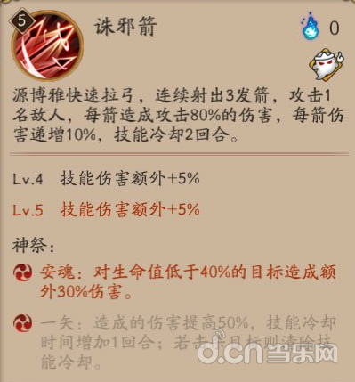 诛邪剑:在②安魂和④一矢里,针对单体,一般来说来说两个都点上的话,可以当成强力补刀技能,配合高爆发输出的式神,基本一箭一个~强力单体输出