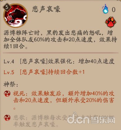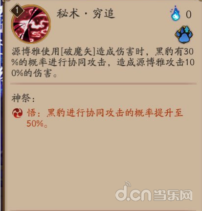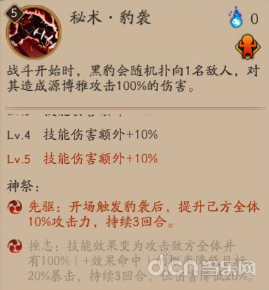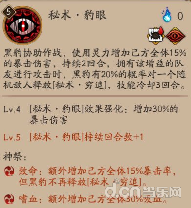秘术·豹眼:组合①嗜血和⑥致命,无论什么副本必带的技能,致命主要是补充还没有慢暴击的式神,但是缺点是没了附近的穷追伤害~