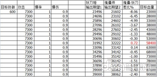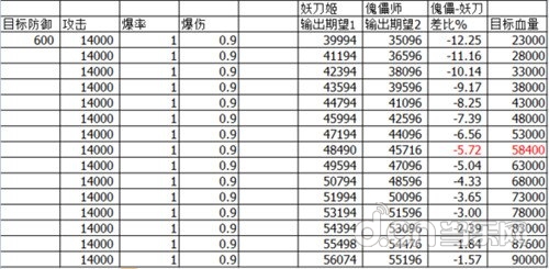 假设面板数据完全一致,图表数据为平民数据,目标防御选取为600。可见傀儡师伤害要高于妖刀姬的条件是十分苛刻的,目标血量区间范围小,且需要一定的高防御,图表峰值高出的伤害连1%都未到,在目标低血量和高血量情况下都是妖刀姬优势。更重要的是傀儡师攻击A暴击B!