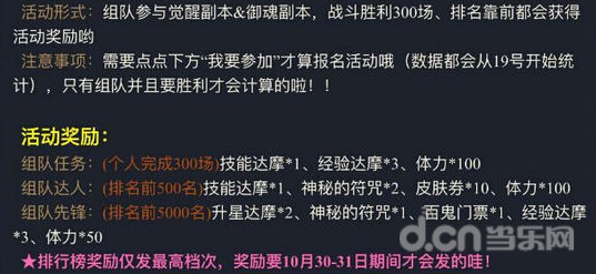 阴阳师手游开启组队大作活动,只要在10月19日-10月28日组队参与觉醒副本、御魂副本达到300场就可以获得达摩、勾玉在内的奖励,下面就让小编详细的为大家介绍下此次的阴阳师组队大作战活动吧。