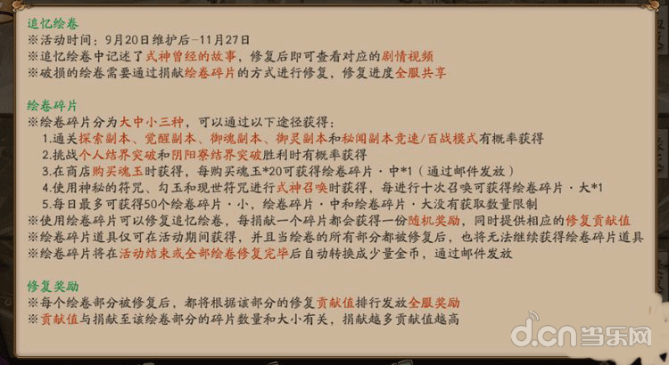 *绘卷修复后,可查看对应的式神回忆视频,同时根据捐献贡献排行,发放全服奖励,每个服务器前20名更可获得对应式神奖励。