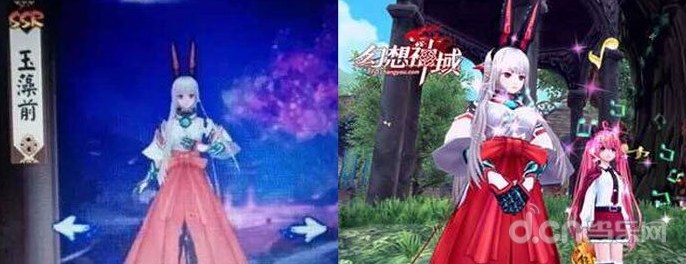 通过对比图可以看出,这张的图鉴是把幻想神域里面的玉藻前挖出来再放进去,所以这是假的。