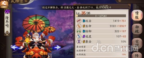 独有的穿晴明盾给上控制,算是神技,但是这个控制盾强度跟攻击相关,所以厚度一般,能否控制辅助两回合不好说,像堆暴击的辅助输出也不低的。群盾与鲤鱼精生命值有关。低配版一目连。不过与匣中少女一样,盾会被驱散。还有个缺点跟一目连一样,耗火非常高。