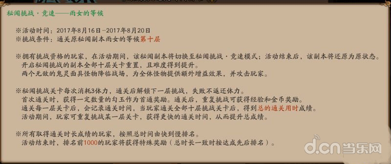 活动期间,指定秘闻副本的全部十层关卡首通奖励将会刷新,且难度得到提升;系统将根据通关全部关卡的总时间进行排名,排名前列的玩家将获得限时特典表情等奖励。