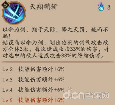 △天翔鹤斩,是一个单体伤害与群攻相结合的技能,以肉眼难以捕捉的速度攻击敌方群体,并对最终目标施以致命一击。