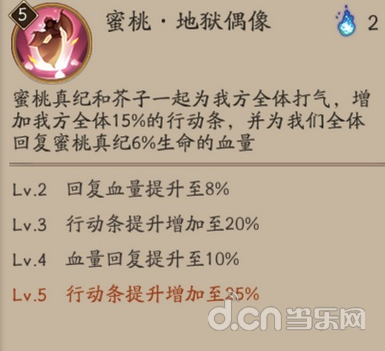 【蜜桃地狱偶像】:蜜桃真纪和芥子一起为我方全体打气,增加我方全体15%的行动条,并为我们全体回复蜜桃真纪6%生命的血量。
