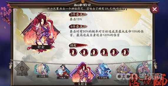 妖狐:4针女+2暴击,4轮入道+2暴击,如果阵容火不紧张的话,速度攻击暴击都是可选属性,暴击优于攻击。