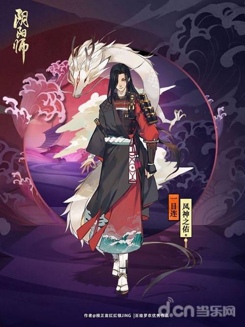 【一目连·风神之佑】 “风神之佑”源自“百绘罗衣”式神皮肤设计大赛中优秀画师@根正苗红红领JING 的作品。白龙盘踞在后,黑发之下眼神温和却坚定,漆黑战袍和铠甲昭示着意志,火红衣摆镌刻着被狂风掀起的滔天怒浪。若要守护他人,自身必得拥有更强大的力量,身为堕神的一目连,也许比谁都更清楚这个道理吧……