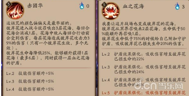 ※「赤团华」技能调整:彼岸花进入战斗就召唤出3层花海,每回合花海会消减1层。花海中敌人每回合行动前会受到伤害,每层花海造成彼岸花攻击力39%的伤害(只有一个彼岸花生效,多个无效)。彼岸花生命每降低25%,能够额外获得1层花海(最多6层),同时获得一层血之花海的护盾。(原技能造成彼岸花攻击力56%的伤害)
