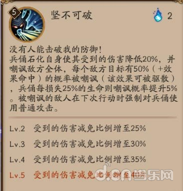 兵俑消耗当前生命的10%石化自身,使自身受到的伤害降低5%,并嘲讽地方全体。被嘲讽的敌人有60%(+效果命中)的概率在下次行动时控制对兵俑使用普通攻击。