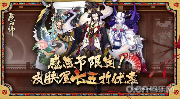 【感恩节限定 福利大礼包】 在各位阴阳师大人的有爱接力下,感恩节皮肤屋限定折扣已达最高——七五折!在11月23日感恩节当天,皮肤屋将开启24小时的限时优惠,所有阴阳师大人在选购皮肤时均可享受七五折的优惠!