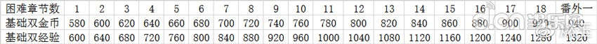 各个章节的经验与金币一览例如已知收益最多的番外一,虽然差了3个章节,其经验只比困难16多了人均120,只相当于困难16 的10%,金币更是只多了6.8%。