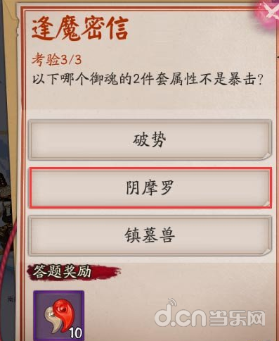 阴阳师逢魔之时密信问题:以下哪个御魂的2件套属性不是暴击?看看选择哪个才是封魔之密信这道题的正确答案。