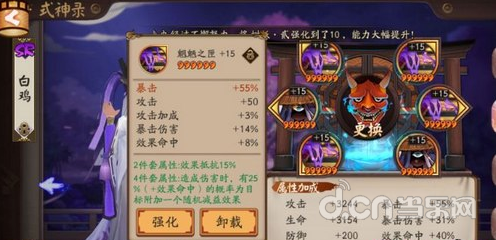 魍魉的二件套属性加了效果抵抗,在PVP看脸斗鸡,真的150%抵抗的大佬也会被魍魉晕住,30%抵抗的脸帝也会无视控制,因此还是需要一点抵抗来能让人看脸。其次效果命中对控制输出流的小白也很重要,别问我40%的效果命中哪里来的,相信肝过御魂的大佬都不希望看到+15的御魂强化到效果命中,然而说多了都是泪。这里我的小白二号位主属性带的速度,四号位带的攻击加成,六号位带的暴击。因为小白还是蛮吃攻击加成的,因此凑东凑西凑出来的二件心眼套,御魂的副属性尽力叠效果命中到100%+,脸帝可以忽略。这套御魂真的暖暖的很贴心,不逊色于针女小白的输出(实测只略微低一点),而且又有控制,经常一个大招沉默+混乱+晕,看着不要太爽。