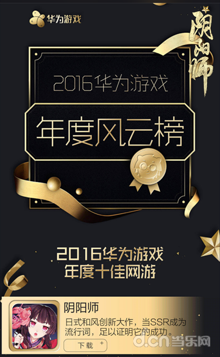 12月30日,华为游戏正式发布“2016 华为游戏年度风云榜”,《阴阳师》凭借极致唯美的游戏品质、LBS等创新的游戏体验、SSR话题等全球范围内的游戏影响力成功入选年度十佳网游,本次华为游戏风云榜的评选标准覆盖了多个维度,涵盖了游戏评分、搜索量、下载量、日活、留存、收入等指标,能够入选的产品都是得到亿万华为玩家高度认可的精品游戏。在此,感谢华为游戏和华为玩家对《阴阳师》的大力支持和厚爱。