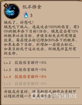 俗话说:有特效的普攻就是好普攻,饿鬼的普攻这次可以说是加强效果最大的,最高125%的伤害,20%的概率偷取目标BUFF,亲测吸血姬的BUFF也能偷。30%+效果命中叠加一层馒头。