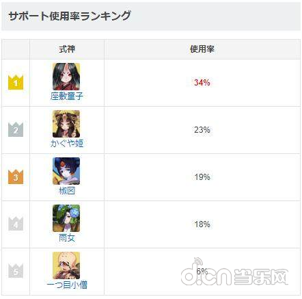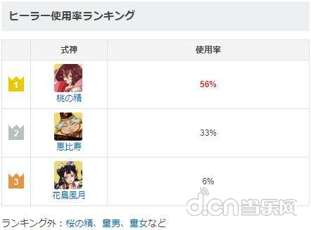 使用率最高的奶妈式神是桃花妖,这份排名里面已经看不到草爹了。不得不说,桃花妖是当前版本最强势的奶妈,可以复活容错率较高,血限过低的情况下抬血限。而且它的入手门槛非常低,第八章挑战可以用挑战券刷桃花。