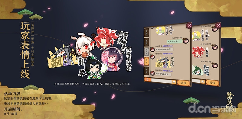 9月30日维护后,五名玩家老鼠夫斯基、啊缺、鬼使白、田八、好多虫自制的优质《阴阳师》表情包将在游戏内同步上线,萌化你的聊天频道!